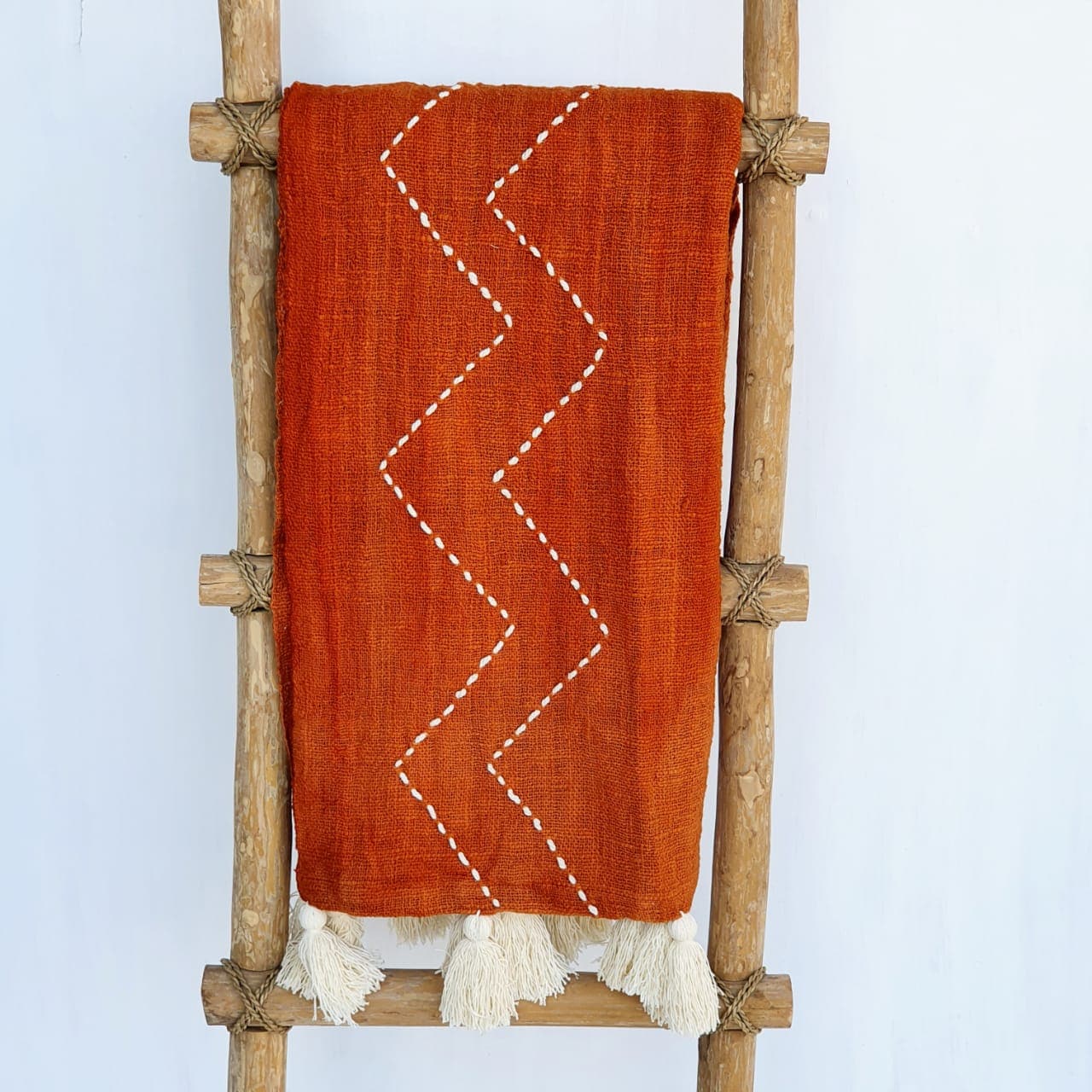 Découvrez ce joli jeté de luxe. Ce plaid en coton brut est disponible dans une belle couleur orange et présente un motif de point zigzag blanc. Cette couverture orange est complétée par des pompons de couleur naturelle assortis. Ce jeté est l'accessoire parfait pour un lit, un salon ou une chaise. Effectuez tous les types de lancers. Intelligent. Élégant.