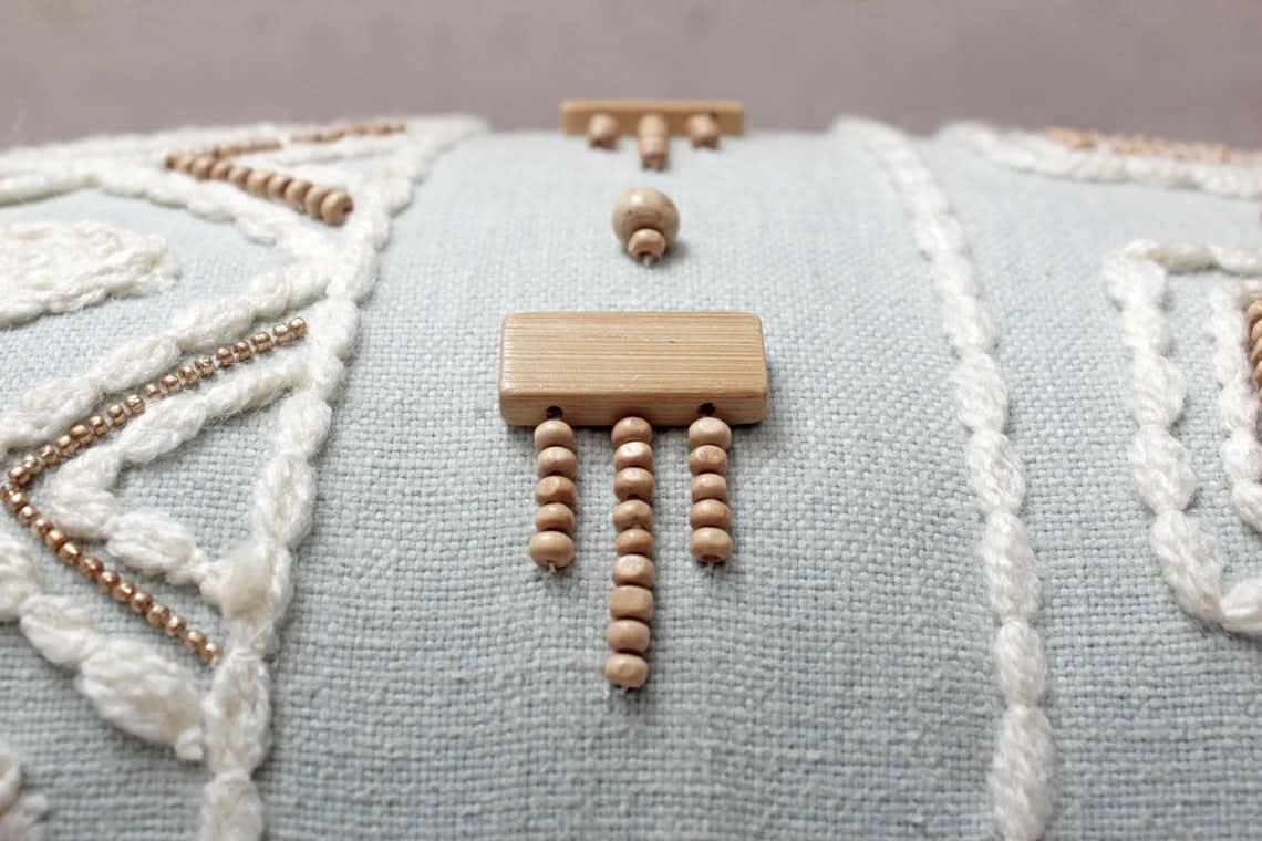 This Luxurious Cotton Embroidered Pillow cover is made with Light Blue Cotton Fabric embellished with Off-white Wool, wooden Beads, golden Beads and Tassels . Perfect to layer your décor with rich traditions of the East. The back side of the Pillow cover is made using the same fabric as front with a flap covered zipper for clean look and east removal.