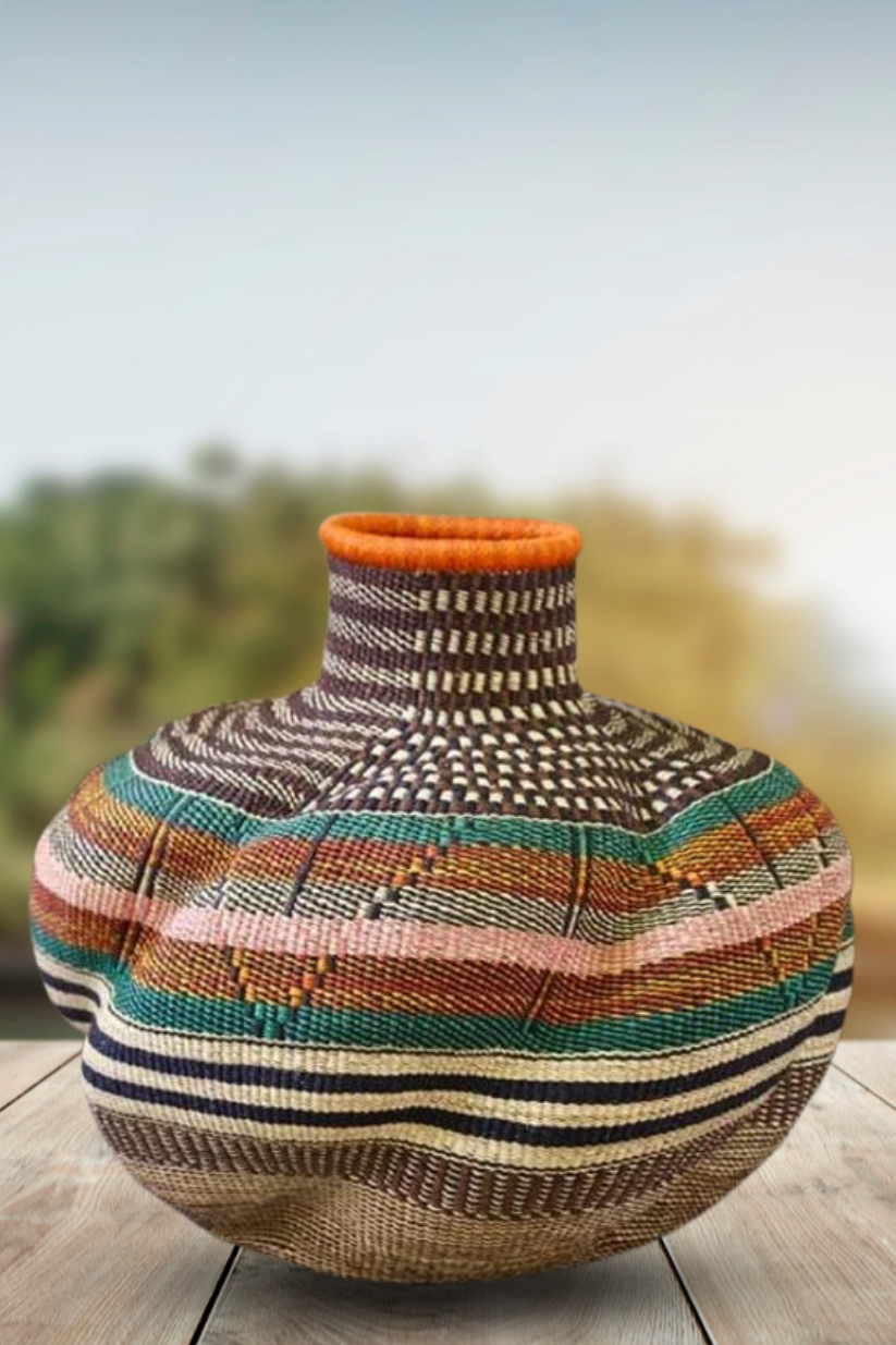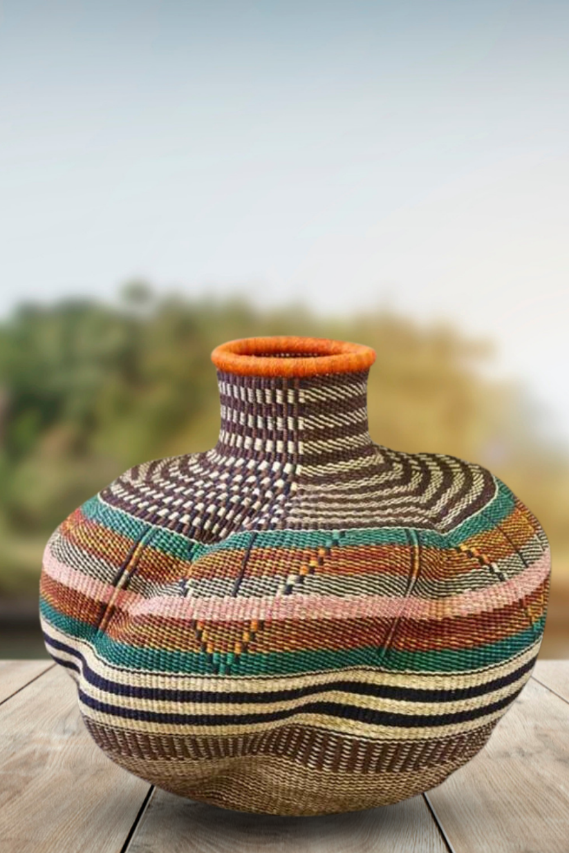 Large twist weave Tribal Ghana Basket in Orange Teal and Pink