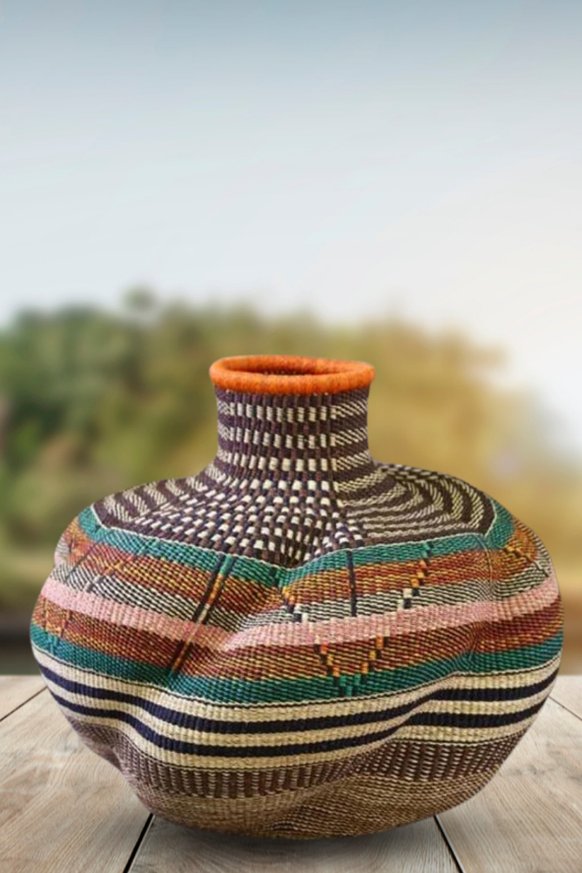 Our gorgeous tribal wavy twisted weave baskets are handmade in Ghana by a team of talented weavers under the supervision of Franci whom supplies them with the Elephant grass to help the local weavers earn very fair wages and raise the communities standard of living.